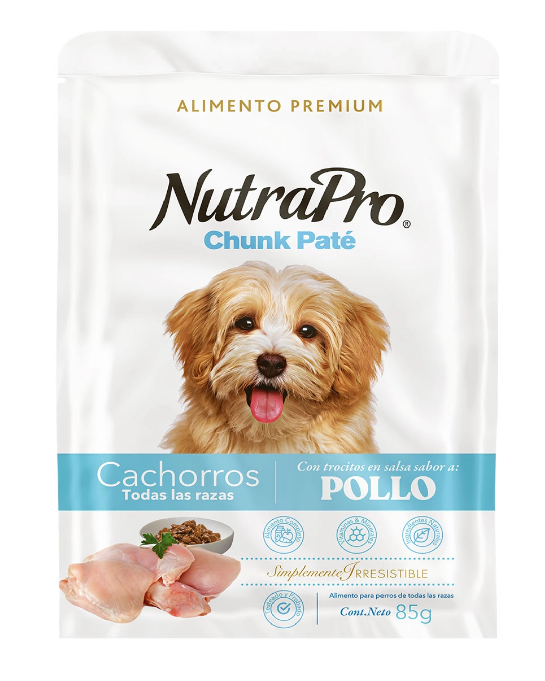 "NUTRAPRO PATE PARA CACHORROS SABOR A POLLO FDA CJ X12" es un alimento húmedo (paté) en formato "chunk" (trocitos) de la marca NutraPro, sabor pollo, diseñado para cachorros, usualmente en presentaciones de envases individuales (pouch o lata) de 85g